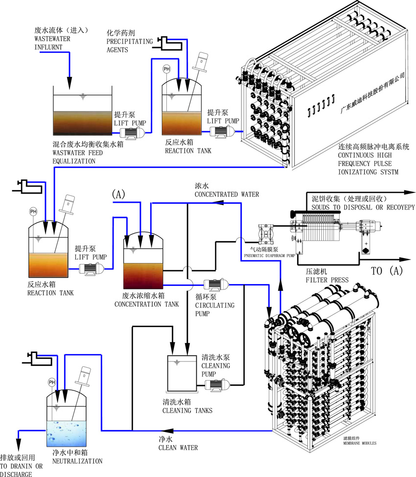 連續高頻脈沖電離膜處理設備是當今世界最新一代電化學水處理設備。連續高頻脈沖電離膜處理工藝能有效去除水中膠體和懸浮類污染物質,并對乳化油、大分子有機物、微生物、重金屬離子、氟離子、濁度和部分有色類物質具有良好的去除效果,因此能廣泛地應用于各類廢水治理和給水處理工程。和傳統化學混凝相比,連續高頻脈沖電離膜處理工藝具有分離效果好、泥渣含水率低、占地面積小、易于實現自動控制等優點。