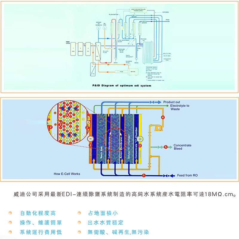 EDI裝置是將離子交換樹脂充夾在陰/陽離子交換膜之間形成EDI單元。利用樹脂制備高純水,利用水電解產(chǎn)生的H+、OH-離子在膜堆內(nèi)再生失效的樹脂。因此EDI系統(tǒng)不需要酸堿再生且能連續(xù)生產(chǎn),系統(tǒng)自動化程度高。