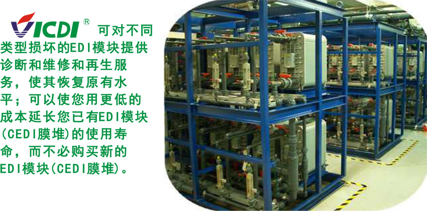 威迪是一家專業(yè)提供超純水技術(shù)服務(wù)的高新科技企業(yè)。公司匯集了一批專業(yè)從事超純水處理技術(shù)研究、工程安裝,售后服務(wù)經(jīng)驗豐富的工程技術(shù)人才,可為廣大客戶和工程公司提供提EDI問題的診斷和維修服務(wù)。本公司具有多年的EDI使用和售后服務(wù)經(jīng)驗。本公司擁有專用的EDI清洗再生設(shè)備、樹脂、陰陽膜片、陰陽極板等配件,對任何原因造成的EDI接頭斷裂、內(nèi)部發(fā)熱燒壞、純水室污堵、濃水室積垢、背部漏水等造成的EDI水質(zhì)下降問題,本公司都可以修復(fù)如新。
