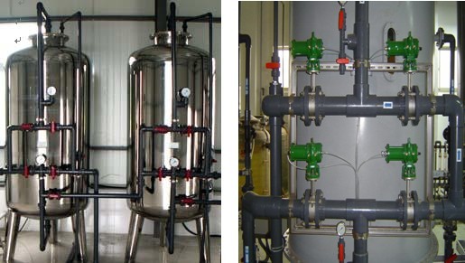 利用石英砂、無煙煤濾料、錳砂等不同介質及濾材,配合專用過濾設備,可將原水中的所有微粒、懸浮物、能見之沉淀物及泥垢過濾。系統配置完善的保護裝置和監測儀表,且具有反沖洗功能,泥垢等污染物很快被沖走,耗水量少,具全自動功能。