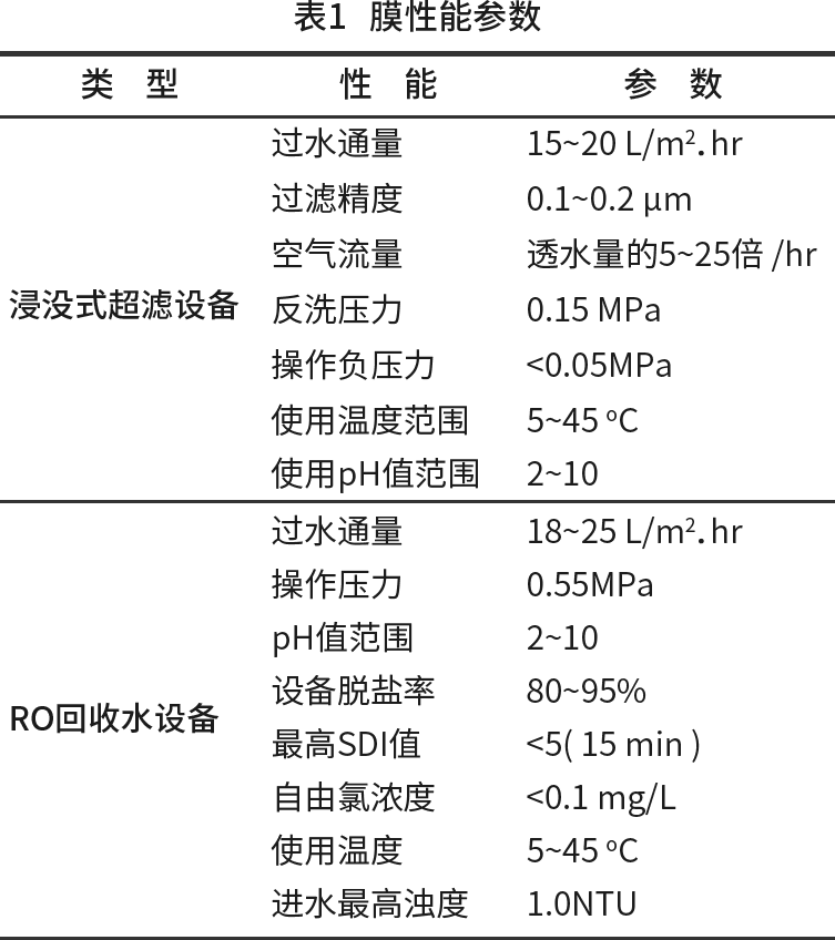 某印染公司的印染廢水中水回用工程由2個系統(tǒng)組成:一是新建了20000 m3/d的物化、生化處理系統(tǒng),使印染廢水COD濃度降到100~200 mg/L;二是配套建成了8000m3/d廢水深度處理的膜處理系統(tǒng),利用“雙膜法”技術(shù)再對印染廢水進行深度處理之后,全部回用于生產(chǎn)中,本工程采用的膜性能參數(shù)詳見表1。該工程處理污水量20000 m3/d,其中回用8000 m3/d,占地面積20000m2,建筑面積3000m2。