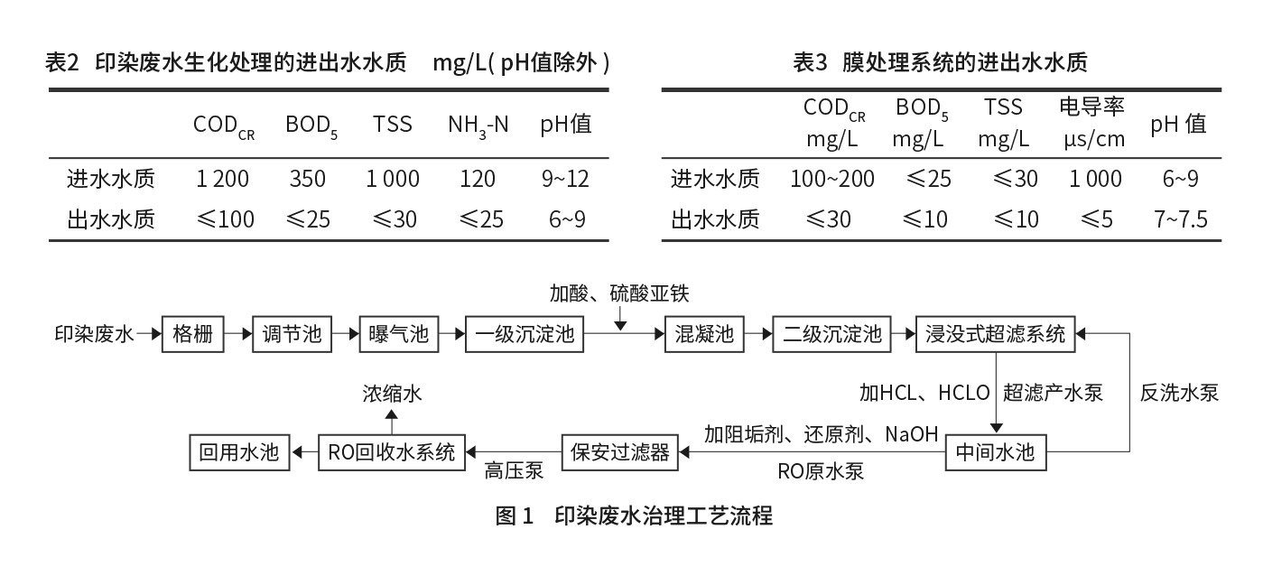 針對印染廢水屬于典型的工業(yè)有機廢水這一特性和可生化性較差并含有難以降解的水溶性有機污染物、SS、膠體狀物質(zhì)等特點,采用了“雙膜法”處理工藝,不僅可以回收水資源,實現(xiàn)廢水循環(huán)回用,而且還可以進一步削減排污總量。