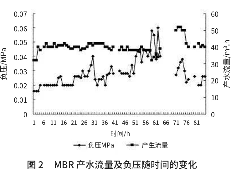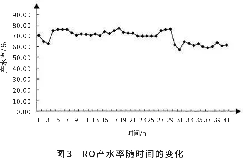 與傳統(tǒng)的生物處理方法和超濾技術(shù)相比,MBR具有生化效率高、抗負荷沖擊能力強、出水水質(zhì)穩(wěn)定、占地面積小、排泥周期長、易實現(xiàn)自動控制等優(yōu)點,是目前最有前途的廢水處理新技術(shù)之一。由圖3可以看出,RO膜的產(chǎn)水率隨著運行時間的增加呈較為平緩的下降。
