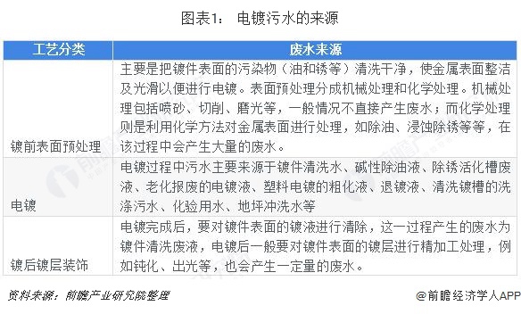 電鍍工藝總共分為三個階段,分別為鍍前表面預(yù)處理、電鍍及鍍后鍍層的裝飾。三個階段根據(jù)鍍種(即鍍層金屬種類)及工藝不同,均能產(chǎn)生大量生產(chǎn)廢水。
