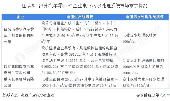 汽車配件生產(chǎn)過程中會排出大量的廢水。廢水主要包含的污染物有:礦物油污、錳、鐵、鋅離子;PO3ˉ、SO42ˉ等物質(zhì),這些污染物嚴(yán)重危害了水體環(huán)境,必須進(jìn)行環(huán)境治理。前瞻產(chǎn)業(yè)研究院統(tǒng)計了一些汽車零部件制造企業(yè)電鍍生產(chǎn)線與電鍍污水處理規(guī)模的對應(yīng)情況,可見電鍍生產(chǎn)規(guī)模越大,對應(yīng)的電鍍污水處理系統(tǒng)的容量越大,據(jù)國家統(tǒng)計局?jǐn)?shù)據(jù)顯示,截至2018年,我國汽車零部件企業(yè)超過10萬家,對電鍍的需求極大,因此對電鍍污水處理系統(tǒng)的需求也非常大,尤其是近年來隨著《電鍍污染物排放標(biāo)準(zhǔn)》(GB21900-2008)執(zhí)行嚴(yán)格性的加強(qiáng),不少汽車零部件企業(yè)開始上線電鍍污水處理技改項(xiàng)目以應(yīng)付部門檢查,對電鍍污水處理系統(tǒng)的需求更加強(qiáng)盛。