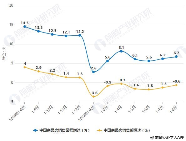 2018-2019年前8月中國(guó)商品房銷(xiāo)售面積、銷(xiāo)售額增速統(tǒng)計(jì)情況