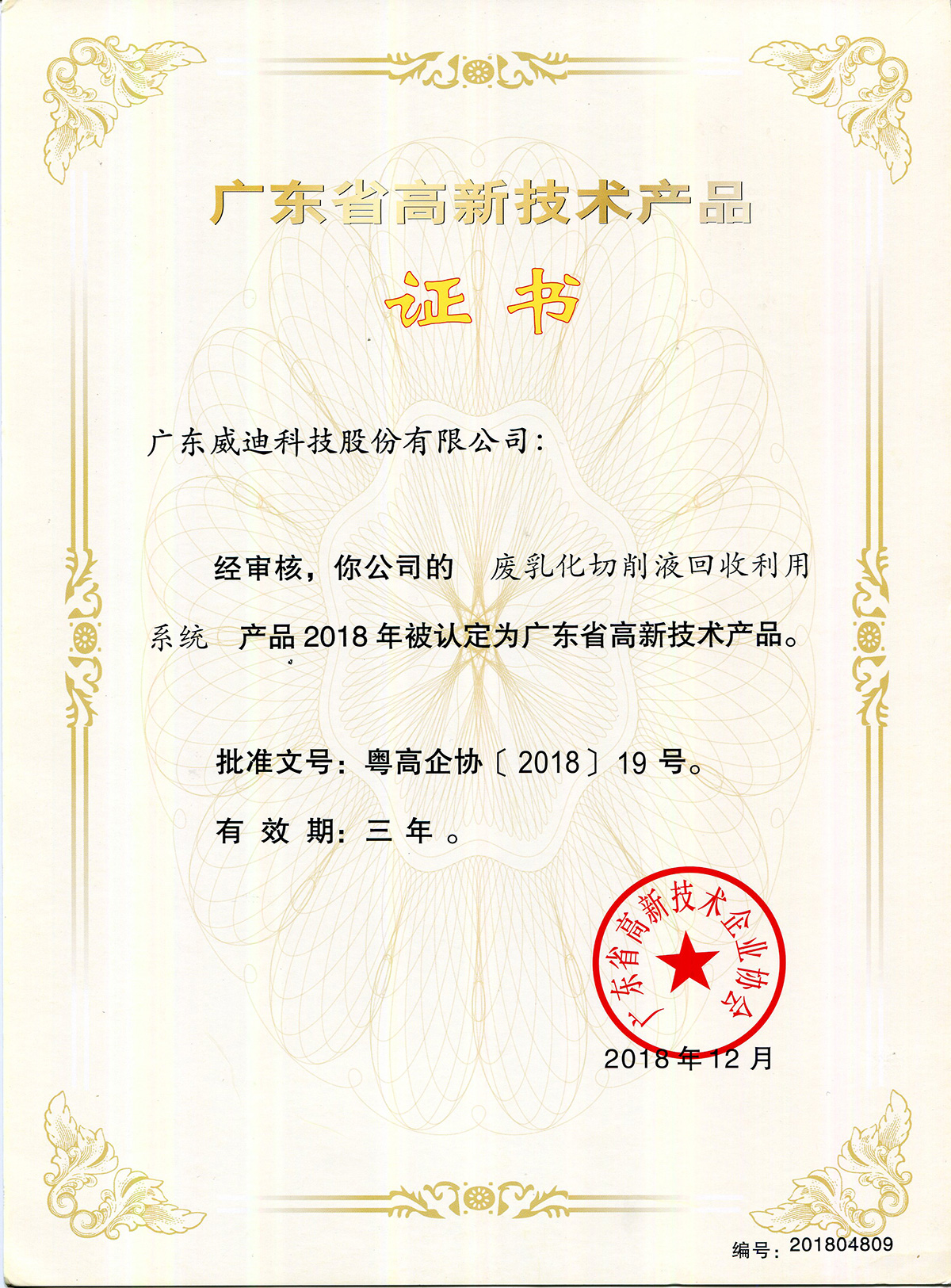 2018年廣東省高新技術產品-廢乳化切削液回收利用系統